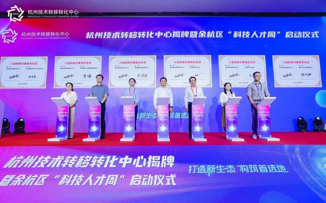 6月5日上午,杭州技術(shù)轉(zhuǎn)移轉(zhuǎn)化中心(以下簡稱“杭轉(zhuǎn)中心”)揭牌儀式暨余杭區(qū)“科技人才周”啟動儀式在杭州師范大學(xué)科技園順利舉行。杭州市政府副秘書長沈凱波,杭州市科技局局長樓秀華,城西科創(chuàng)大走廊管委會黨工委委員、管委會副主任施黃凱,杭州市委人才辦副主任尹凡,杭州市科技局副局長樓立群,杭州市科技局副局長鄧崢,余杭區(qū)委常委、組織部長張立,余杭區(qū)副區(qū)長羅建強,臨安區(qū)委常委、副區(qū)長陳立群,西湖區(qū)副區(qū)長俞暉,杭州資本黨委委員、副總經(jīng)理、杭州科創(chuàng)集團董事長、杭州技術(shù)轉(zhuǎn)移轉(zhuǎn)化中心董事長許寧出席并揭牌。