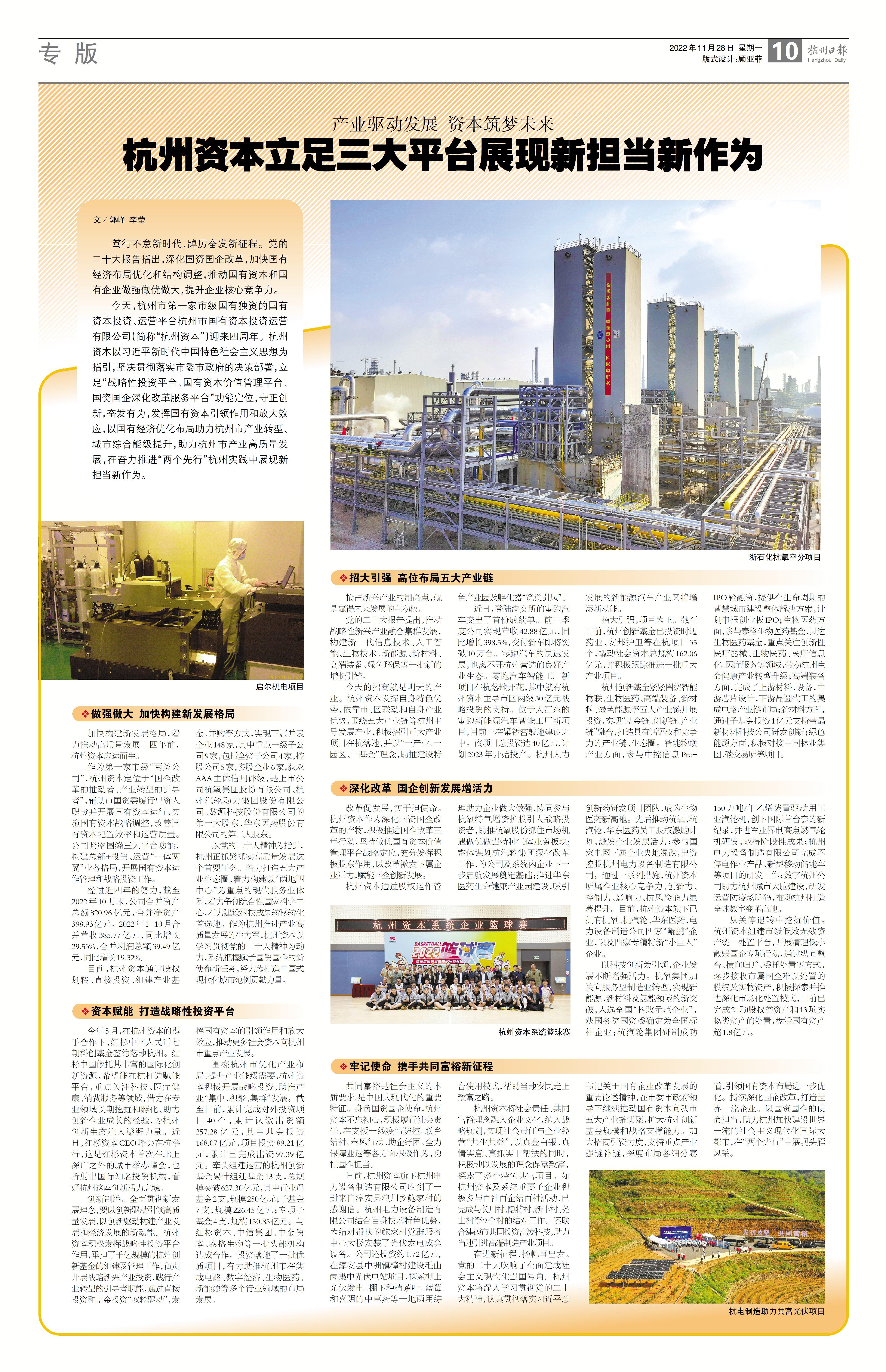 11月28日,在公司成立四周年之際,杭州日?qǐng)?bào)A10版對(duì)杭州資本進(jìn)行了題為“產(chǎn)業(yè)驅(qū)動(dòng)發(fā)展 資本筑夢(mèng)未來(lái)杭州資本立足三大平臺(tái)展現(xiàn)新?lián)?dāng)新作為”的專版宣傳。